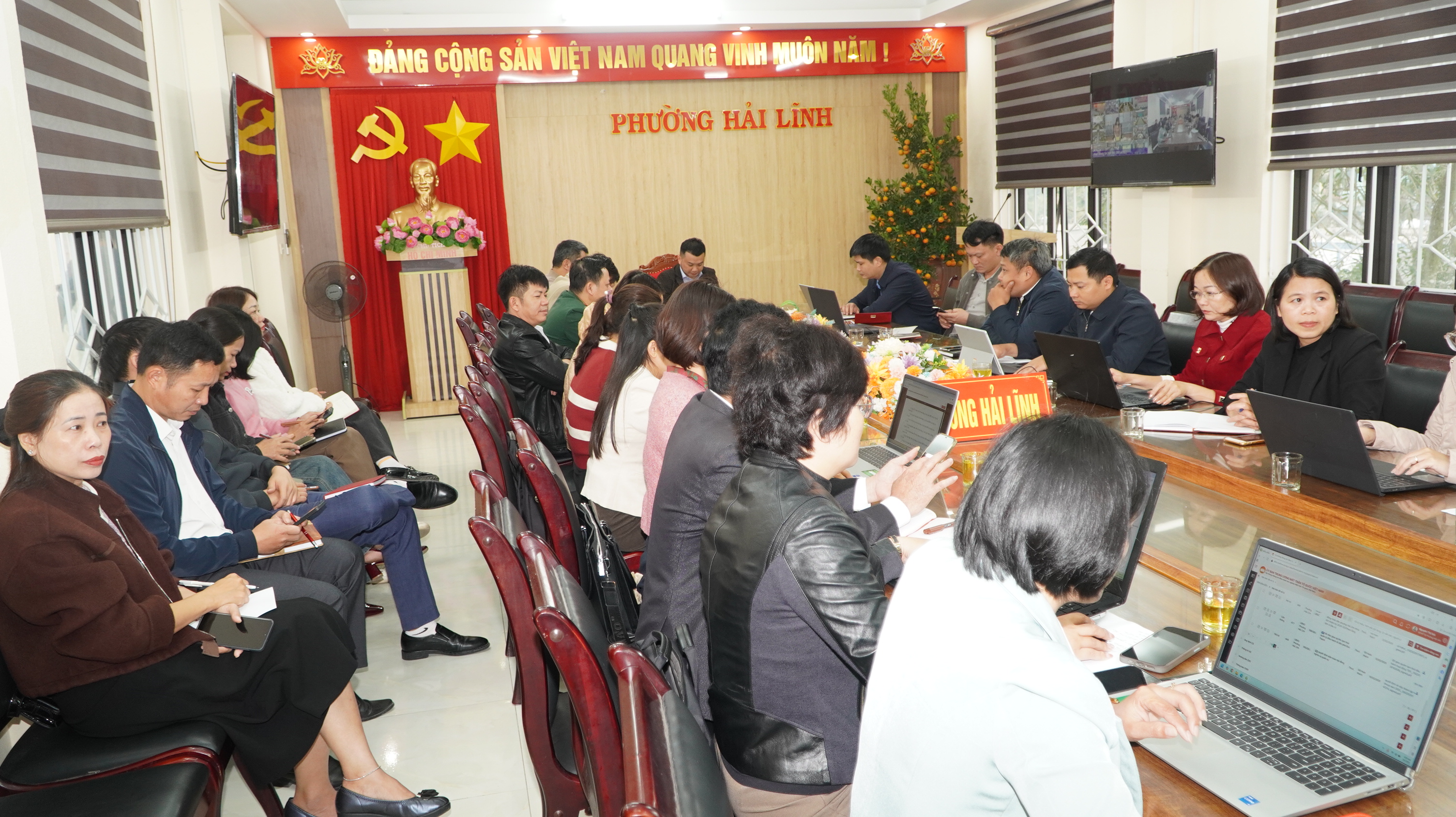 Hội nghị được kết nối trực tuyến đến điểm cầu phường Hải Lĩnh, tỉnh Thanh Hóa. Dự và chủ trì tại điểm cầu phường Hải Lĩnh có đồng chí Mai Xuân Thắng, Phó Bí thư Đảng ủy, Chủ tịch UBND, Chủ tịch Ủy ban bầu cử phường.