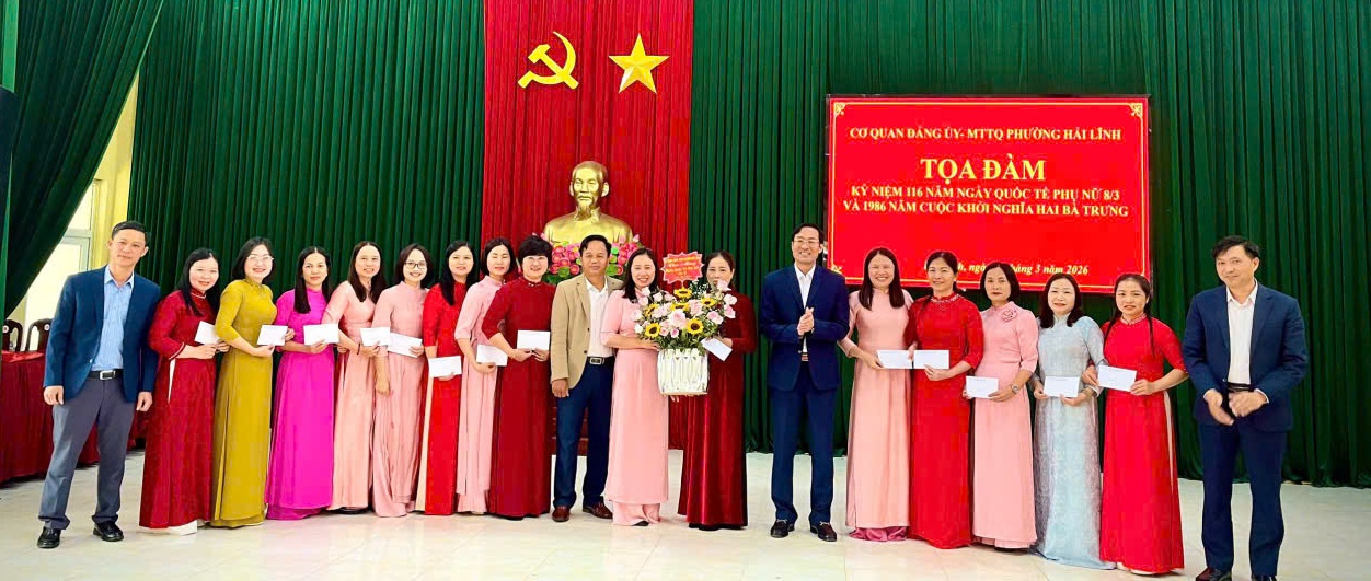Nhân dịp kỷ niệm 116 năm Ngày Quốc tế Phụ nữ (8/3/1910 – 8/3/2026) và 1986 năm cuộc khởi nghĩa Hai Bà Trưng, Hội Liên hiệp Phụ nữ phường Hải Lĩnh đã tổ chức nhiều hoạt động ý nghĩa nhằm ôn lại truyền thống vẻ vang của phụ nữ thế giới và phụ nữ Việt Nam, đồng thời đánh giá kết quả công tác Hội và phong trào phụ nữ năm 2025, triển khai nhiệm vụ năm 2026.
